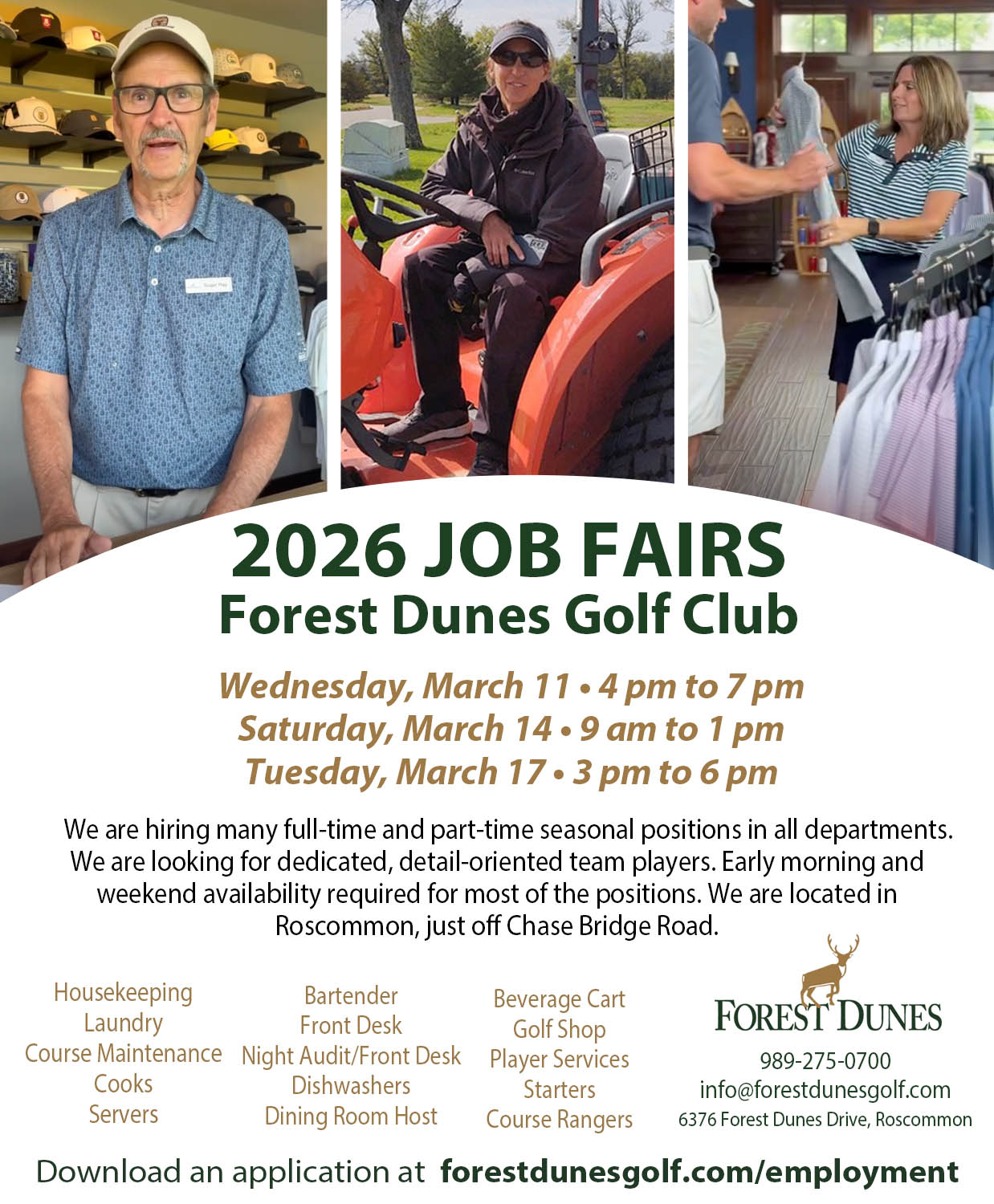 Please print off the Forest Dunes Job Application, complete it, and attend a job fair date or call us to schedule an interview with the appropriate department manager at 989-275-0700.